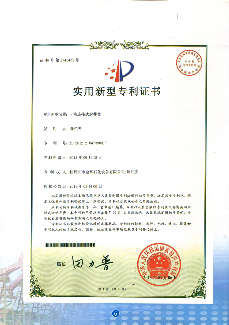 卡箍连接式封井器实用新型专利证书ZL 2012 2 0473983.7