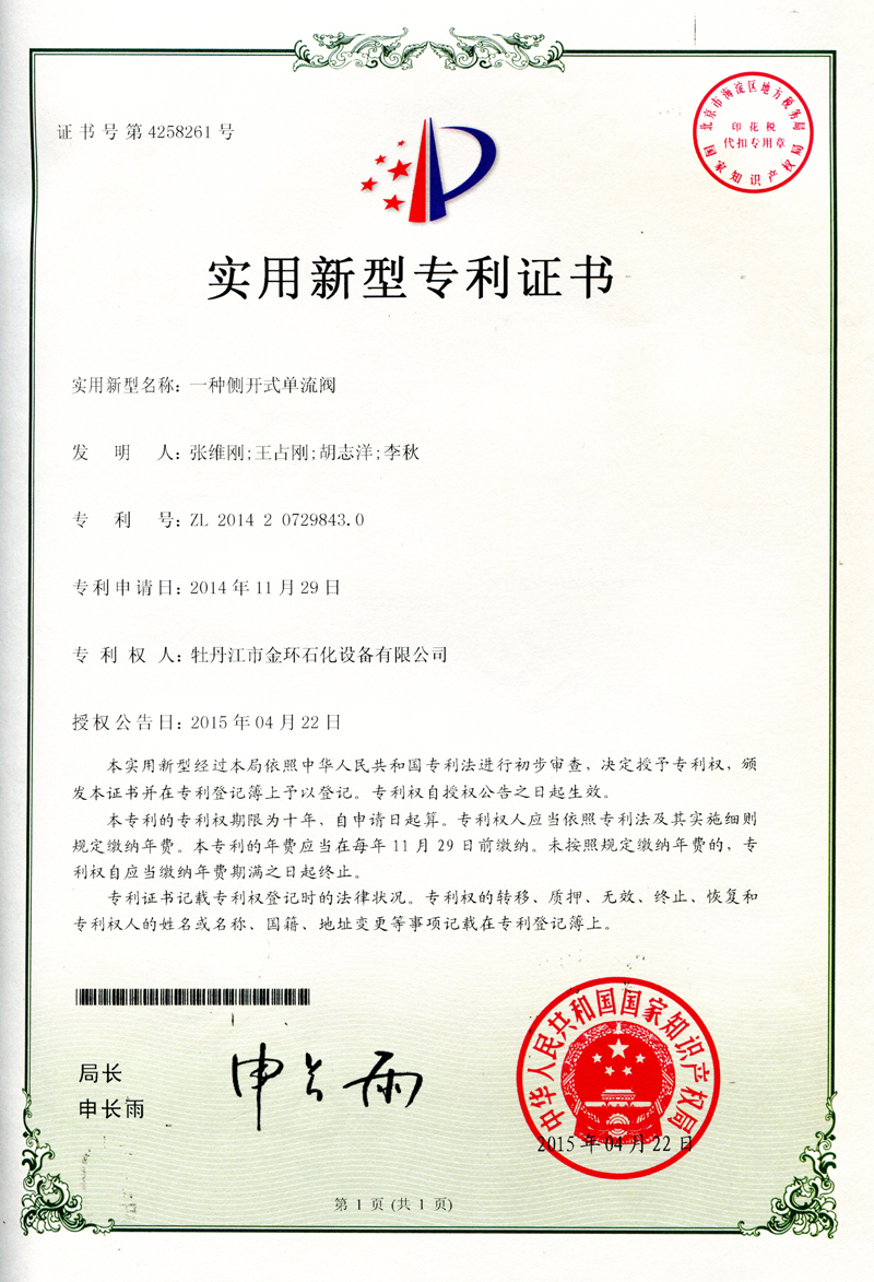 一种侧开式单流阀实用新型专利证书ZL 2014 2 0729843.0