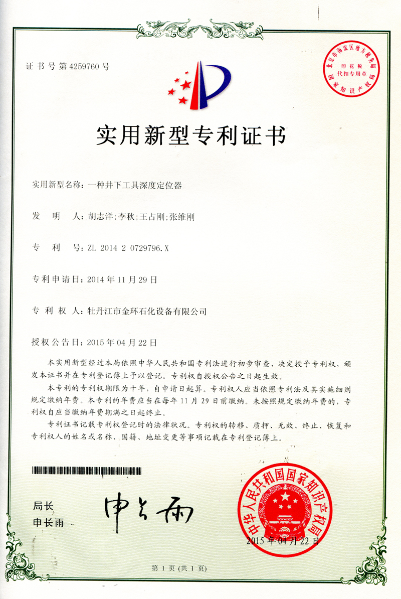 一种井下工具深度定位器实用新型专利证书ZL 2014 2 0729796.X