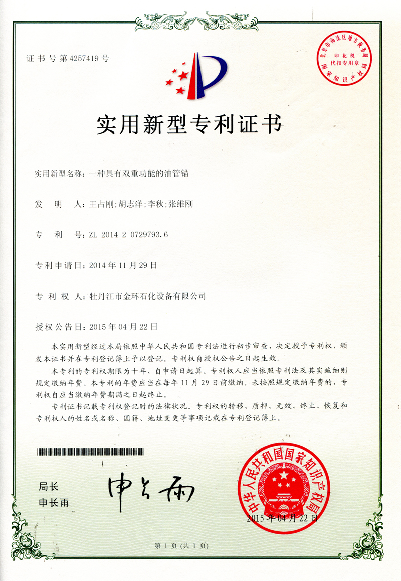 一种具有双重功能的油管锚实用新型专利证书ZL 2014 2 0729793.6