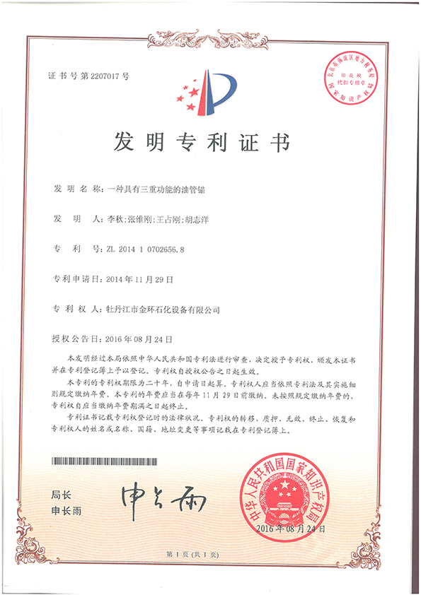 一种具有三重功能的油管锚发明专利证书ZL 2014 1 0702656.8