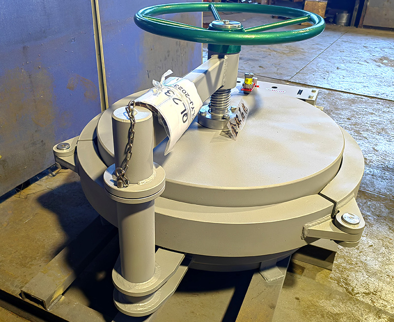 快开盲板是用于压力管道或压力容器的圆形开口上的一种机械装置。一般由筒体法兰、头盖、勾圈或卡箍、密封圈、安全联锁机构、开闭机构、转臂及短节(需要时)等部件构成。